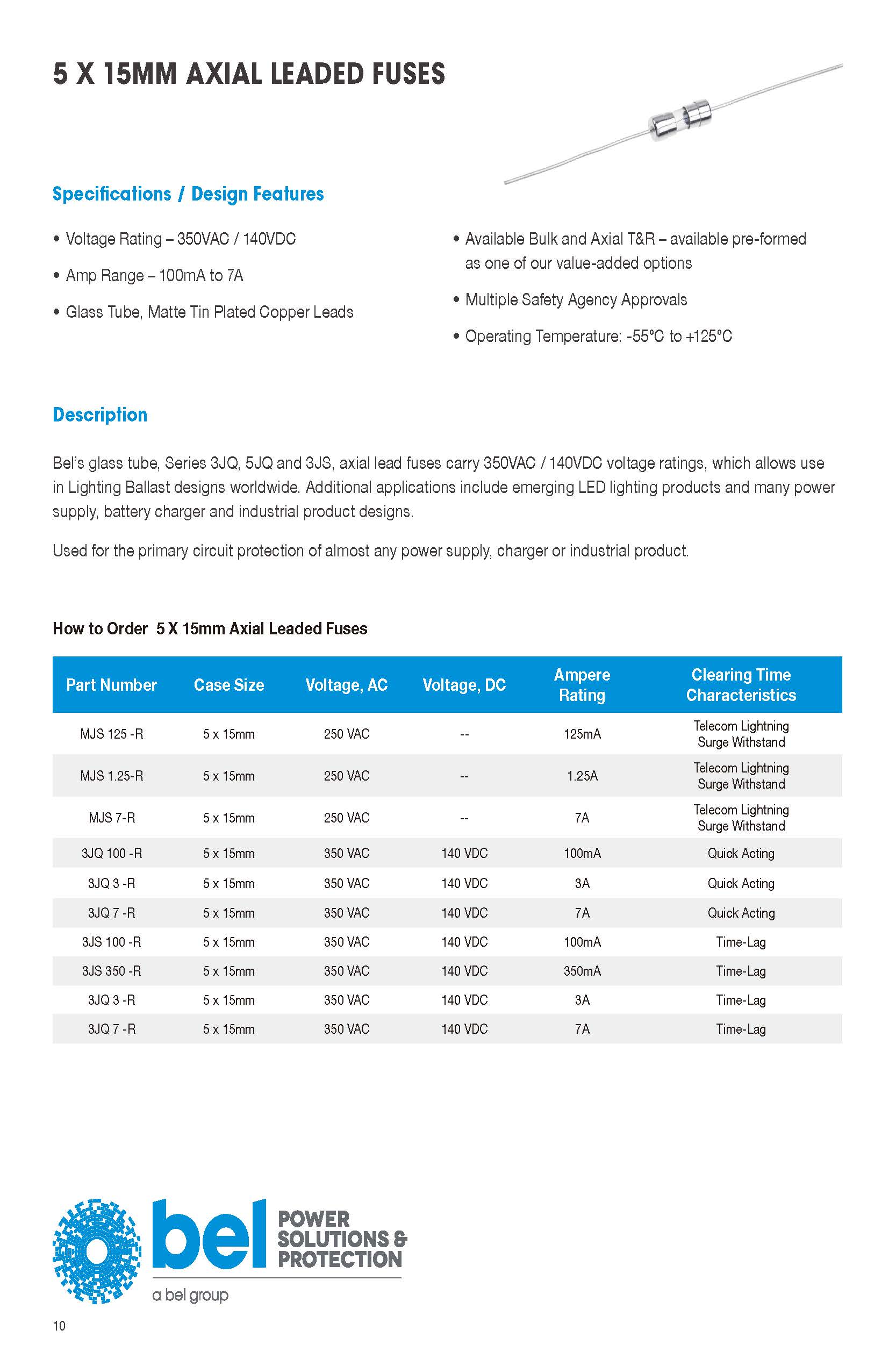 Bel的玻璃管,3JQ,5JQ和3JS,軸向熔斷器攜帶350VAC / 140VDC電壓額定值,允許使用